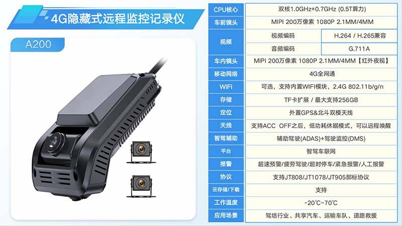 A200 ADAS远程监控:配备双1080P高清镜头,支持高级驾驶辅助系统,显著提升车辆安全驾驶水平。