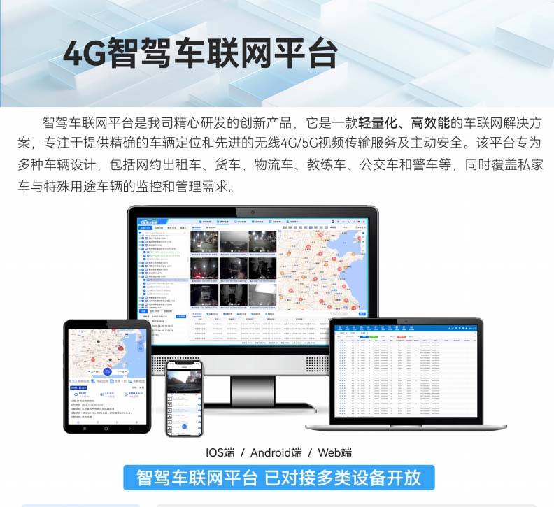 4G智驾车联网平台:轻量化设计,兼具高效能与广覆盖,提供精准定位与无线视频传输服务,广泛应用于网约出租、货车、公交、警用及特殊车辆。