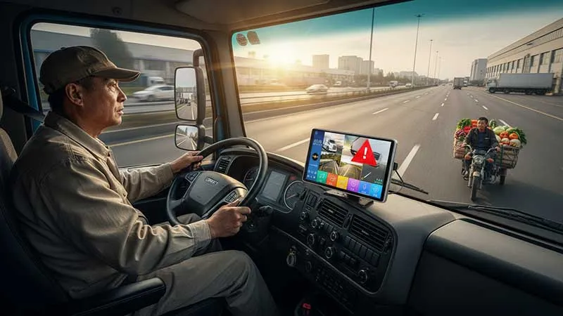 沪宁高速旁的城市物流园区路口,资深货车司机王师傅驾驶重型厢式货车准备右转进入装卸区。此时路口人流车流交织,一辆载着菜贩的电动三轮车紧贴货车右侧行驶,恰好落入王师傅的右侧贴身盲区,而王师傅正专注观察前方路况,丝毫未察觉身旁的危险。就在他转动方向盘的瞬间,卡仕特 H90D 的 BSD 侧向盲区监测系统突然发出急促的 “右侧有危险,请注意” 语音警报,10 英寸 IPS 大屏上的红色预警图标也随之闪烁。