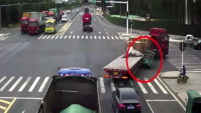 2022年2月17日,福建永春:苏某某驾驶二轮摩托车在真武桥新发超市路口与一辆同向行驶的大货车发生碰撞,导致苏某某受伤。监控视频显示,苏某某在超车时进入大货车驾驶室前方的视线盲区,被大货车追尾碰撞。(来源:福建交警微发布)